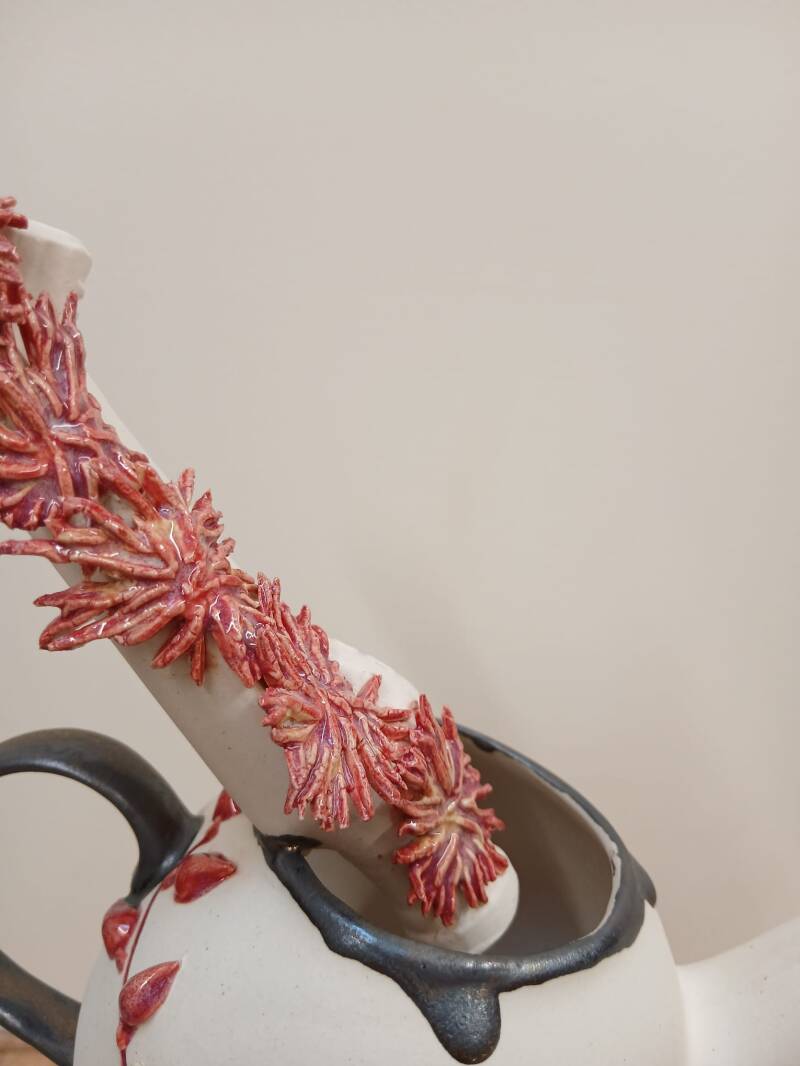 A large piece of artwork from the Pantry with a Threatening Aura is made up of joined kitchenware - two mason bowls, a teapot and a poison bottle. Ricin leaves, flowers and pods wrap around the entire piece....do you want Ricin for Tea?