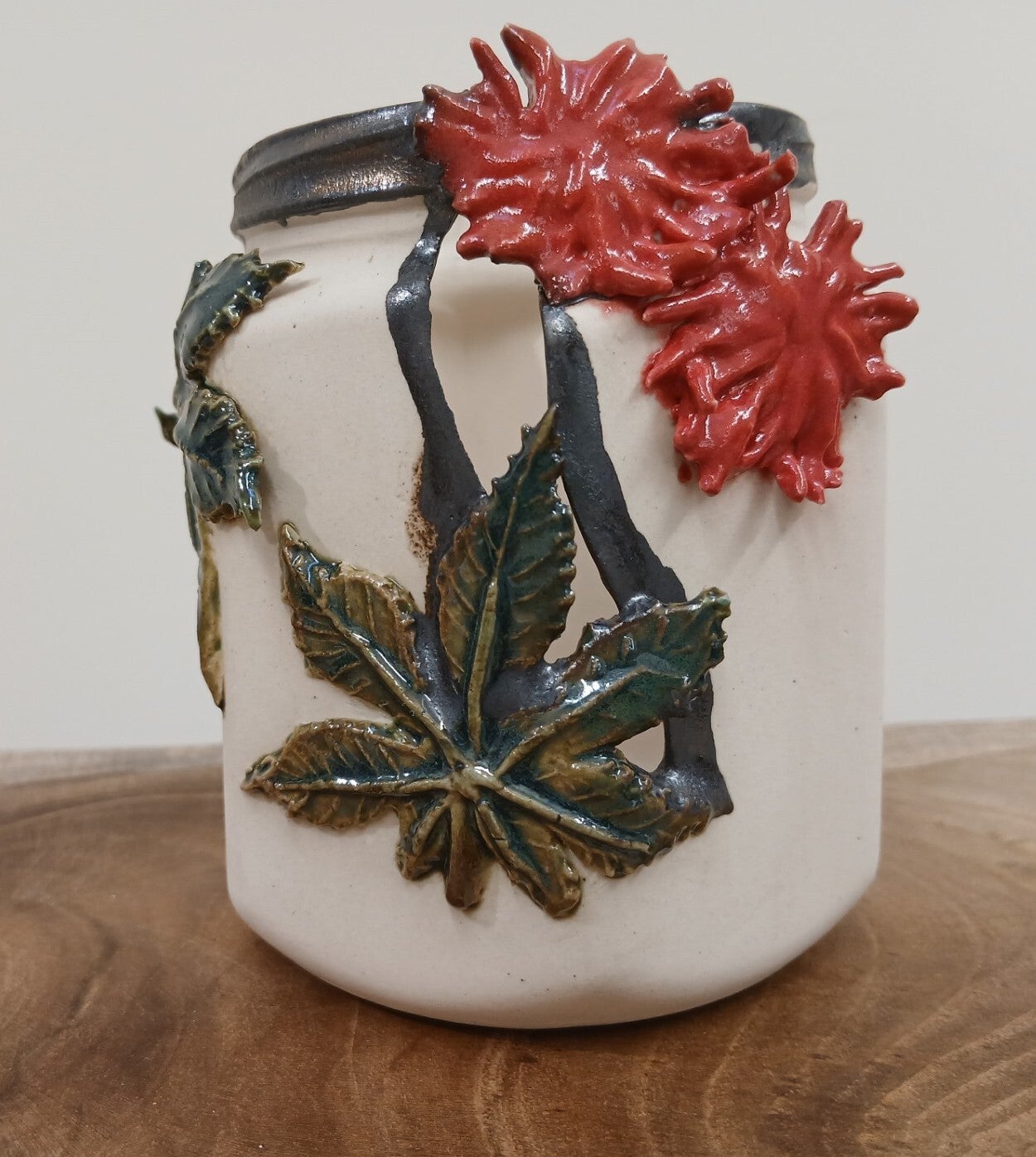 Decorated with Ricinus Communis (Ricin - the Caster Bean plant) sprig moulds, which are glazed.