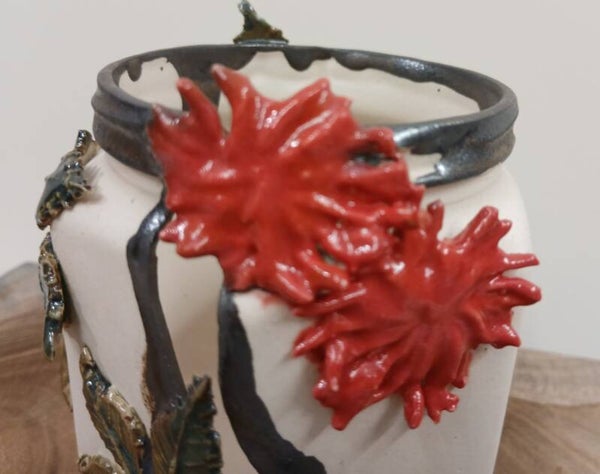 Unglazed slipcast stoneware hexagonal jar - originally a chutney jar from my local Coop! The unglazed jar has been polished to create a pleasing eggshell texture which complements and contracts with the glazed elements of the piece.