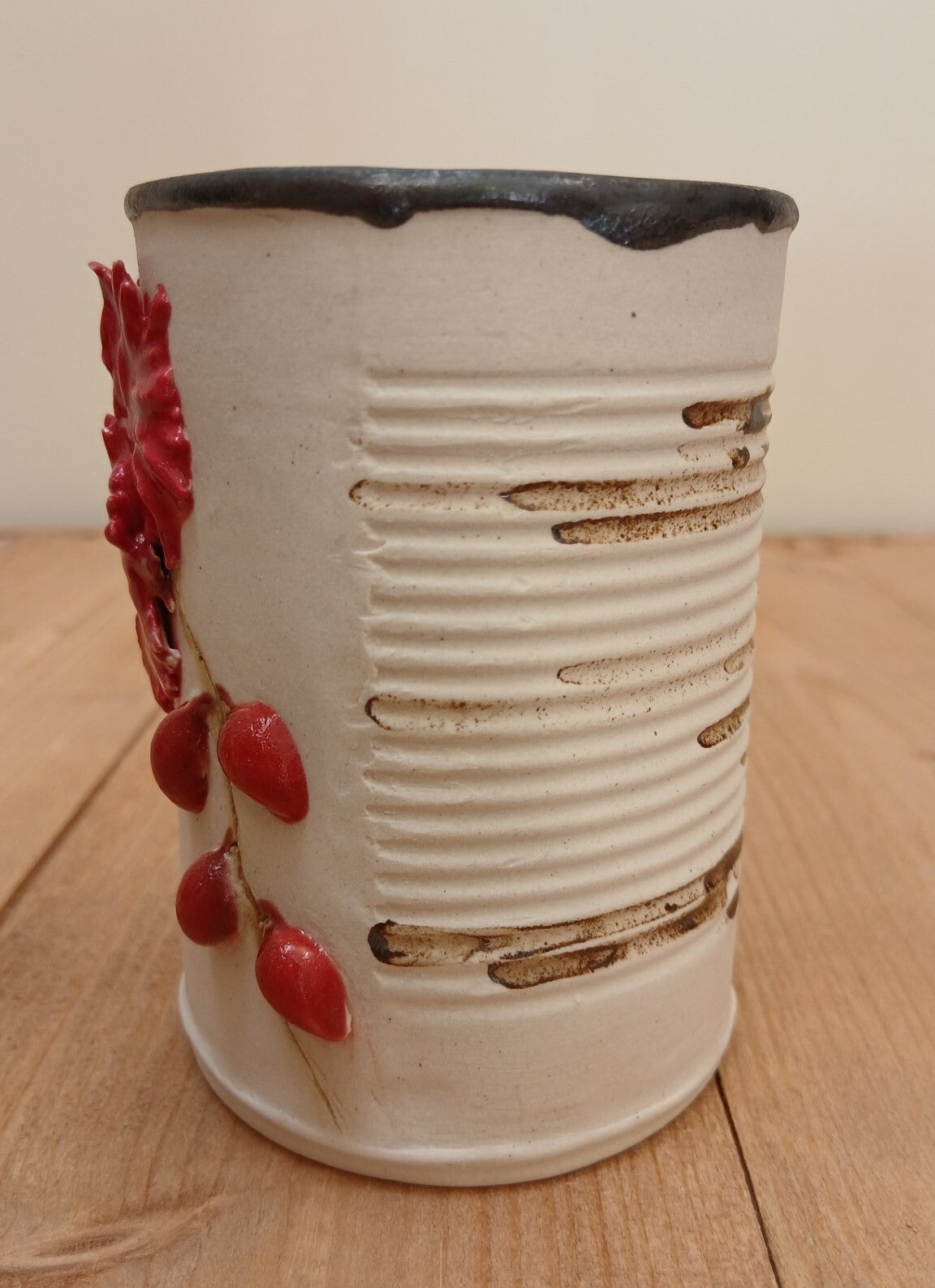 Unglazed slipcast tin can, which has been split post casting. The unglazed can has been polished to create a pleasing eggshell texture which complements and contracts with the glazed elements of the piece.