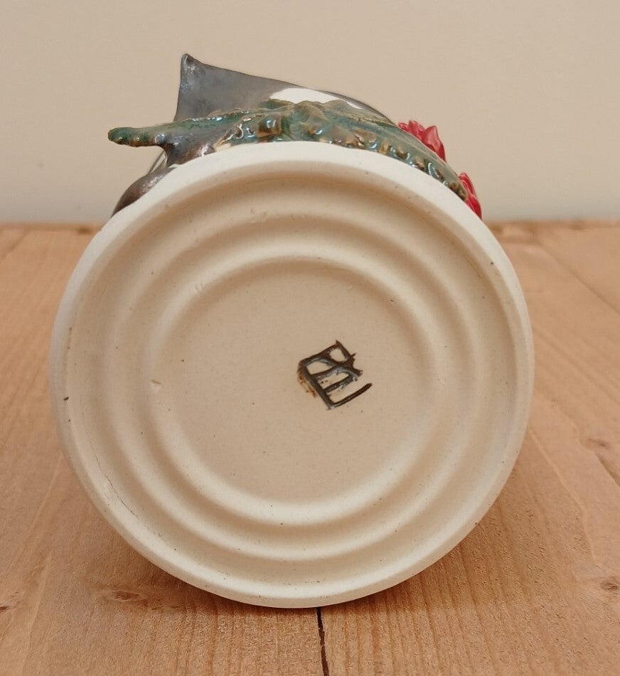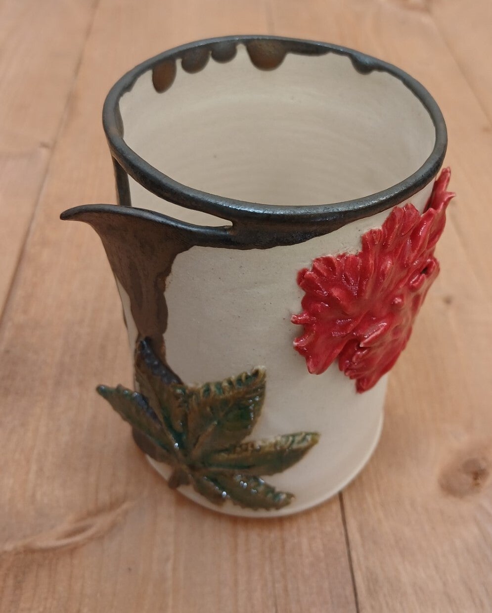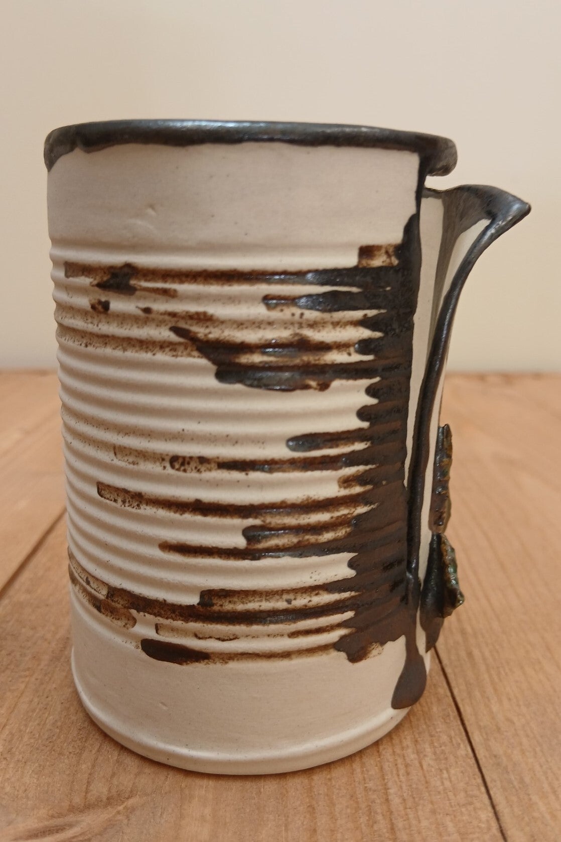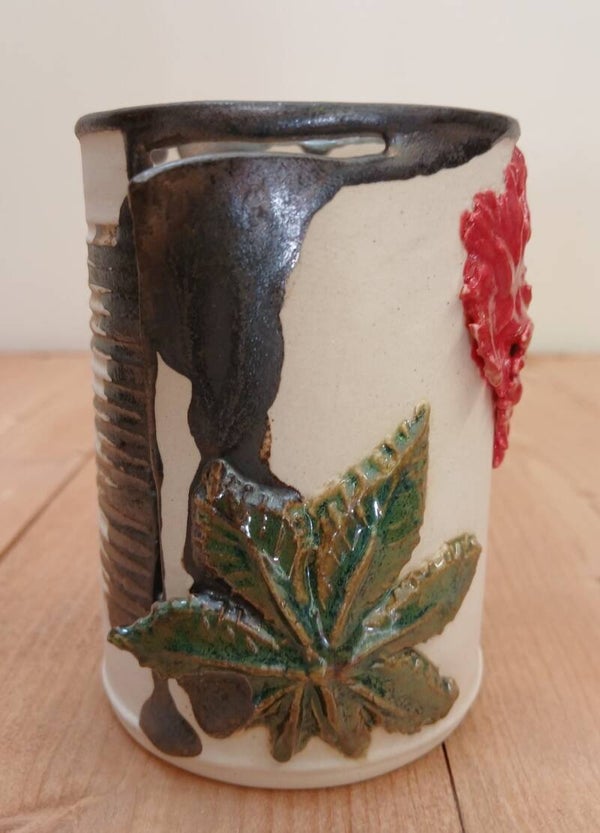 Decorated with Ricinus Communis (Ricin - the Caster Bean plant) sprig moulds, which are glazed. The piece is also drip glazed around the top and the split in metallic black glaze.