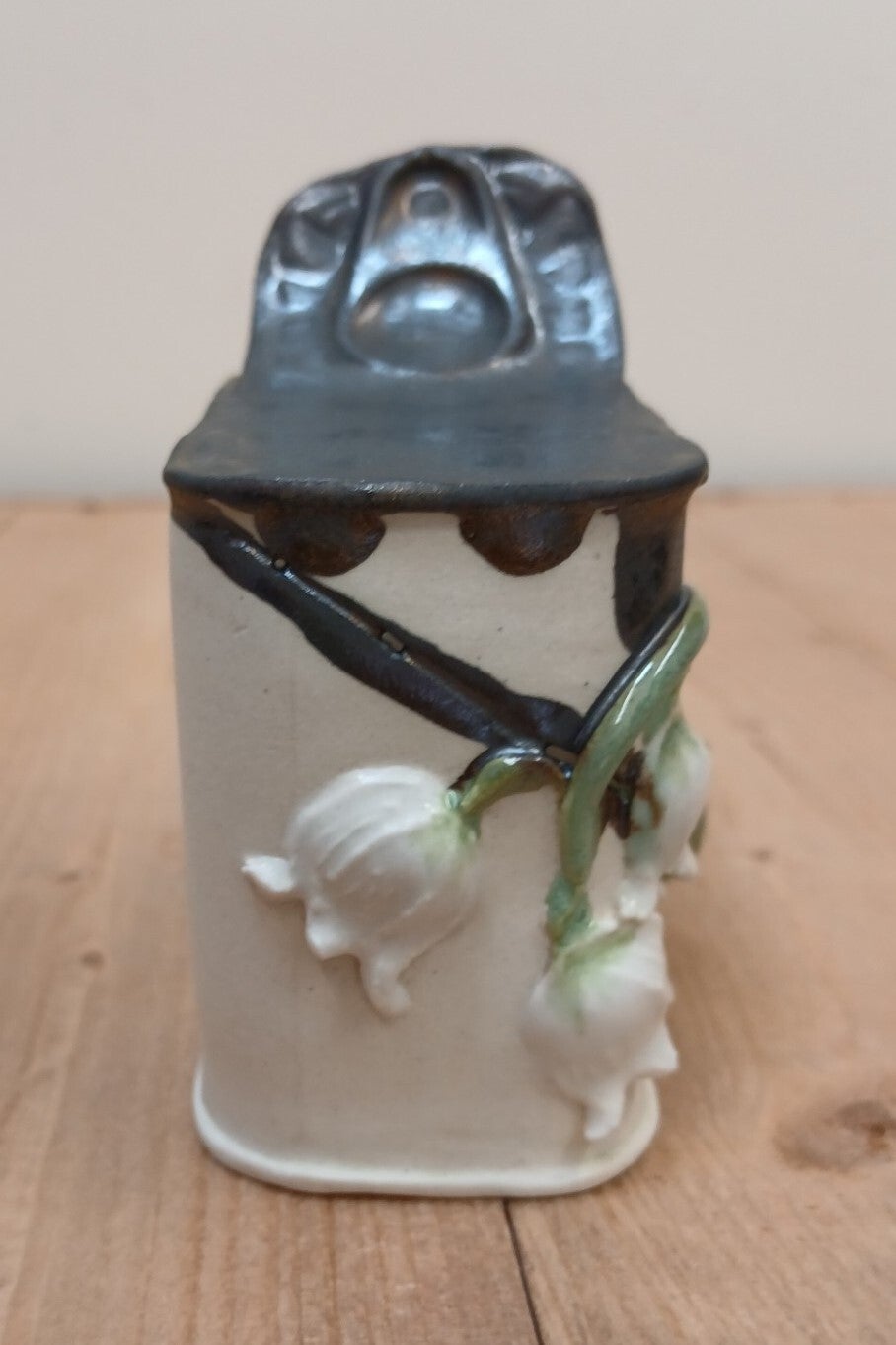 Decorated with Lily of the Valley sprig moulds, which are glazed. The ring pull lid is also glazed in metallic black glaze which is also used to drip glaze around the rim.