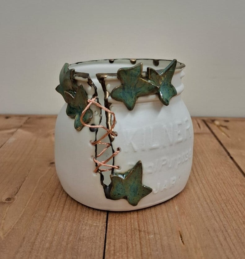 Decorated with English Ivy sprig moulds, which are glazed, as is the damage and the rim. Finally the damage is sewed back together using recycled copper telephone wire.