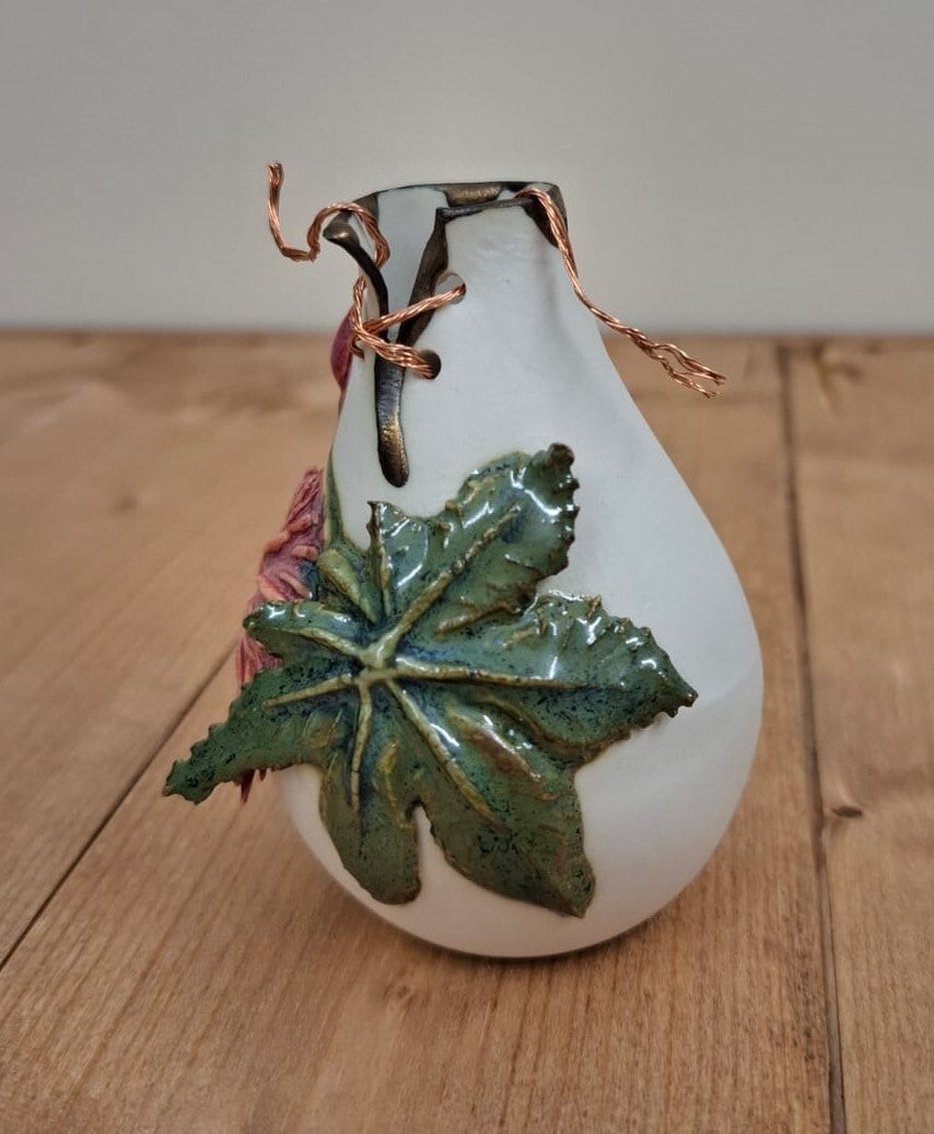 Decorated with Ricin sprig moulds, which are glazed, as is the damage and the rim. Finally the damage is sewed back together using recycled copper telephone wire.