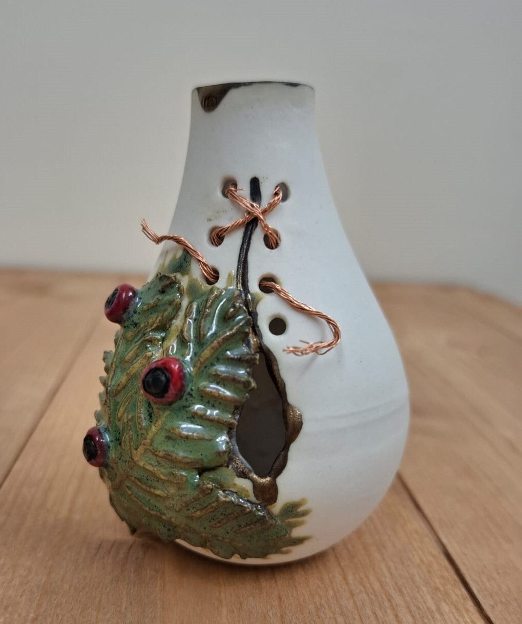 Decorated with Yew sprig moulds, which are glazed, as is the damage and the rim. Finally the damage is sewed back together using recycled copper telephone wire.