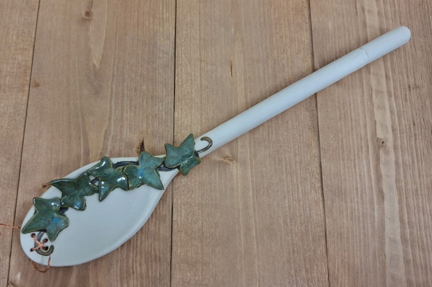 Decorated with Ivy sprig moulds, which are glazed. Finally recycled copper telephone wire is used to sew the spoon.