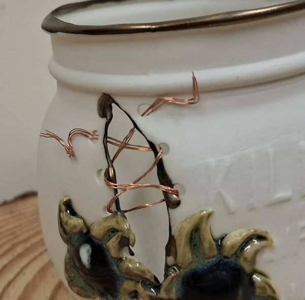 Decorated with Bella Donna (Deadly Nightshade) sprig moulds, which are glazed, as is the damage and the rim. Finally the damage is sewed back together using recycled copper telephone wire.