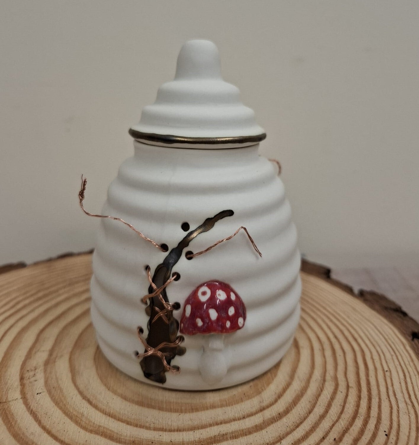 Decorated with Fly Agaric Mushroom moulds, which are glazed, as is the damage and the rim of the lid. Finally the damage is sewed back together using recycled copper telephone wire.
