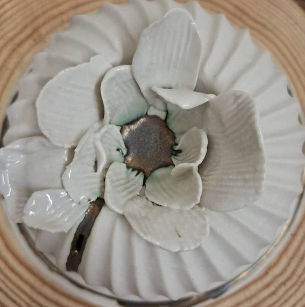 Unglazed slipcast porcelain bundt jelly mould, moulded from an original found in my kitchen when I moved house. The unglazed jelly mould has been damaged then polished to create a pleasing eggshell texture which complements and contrasts with the glazed elements of the piece.