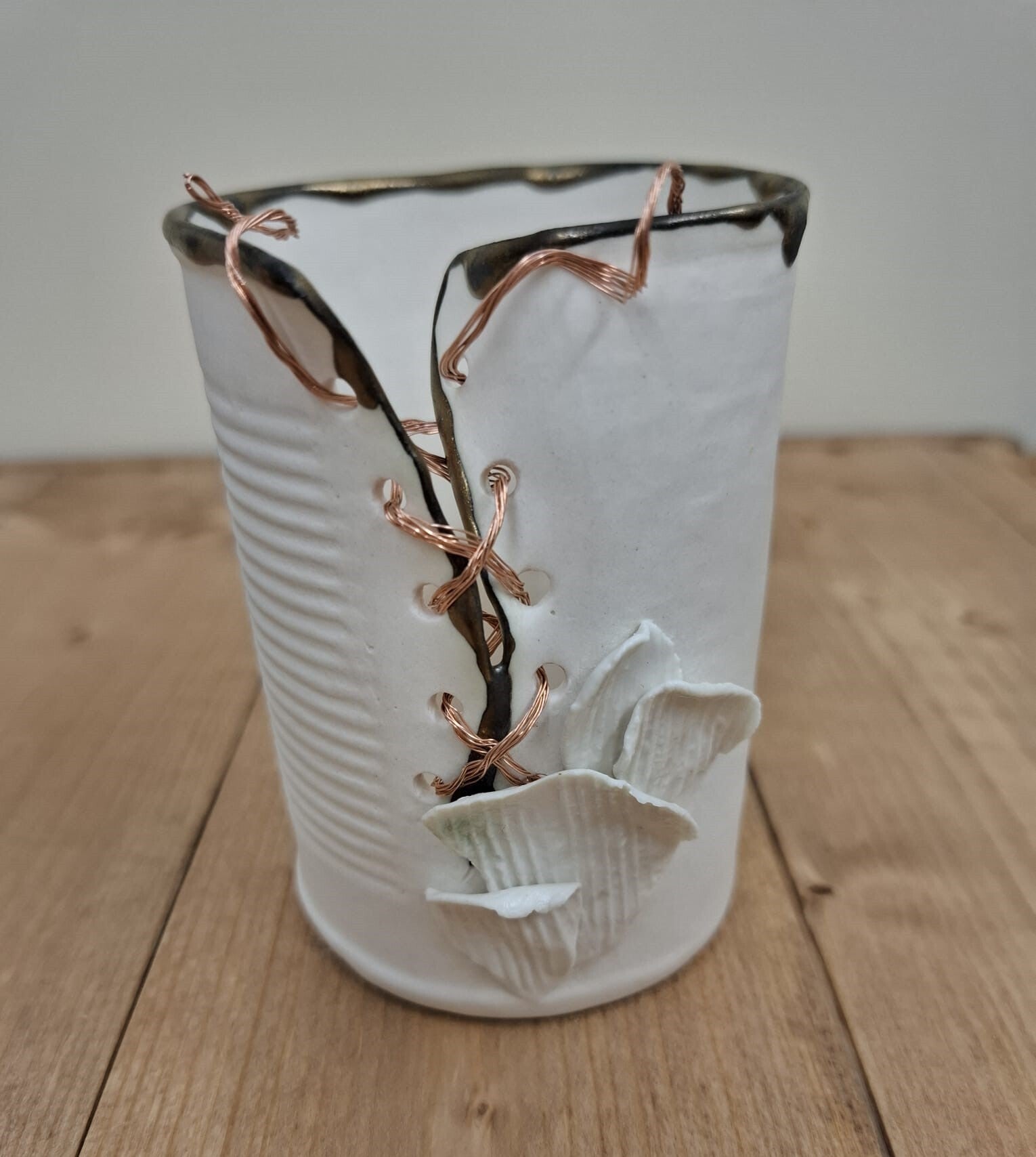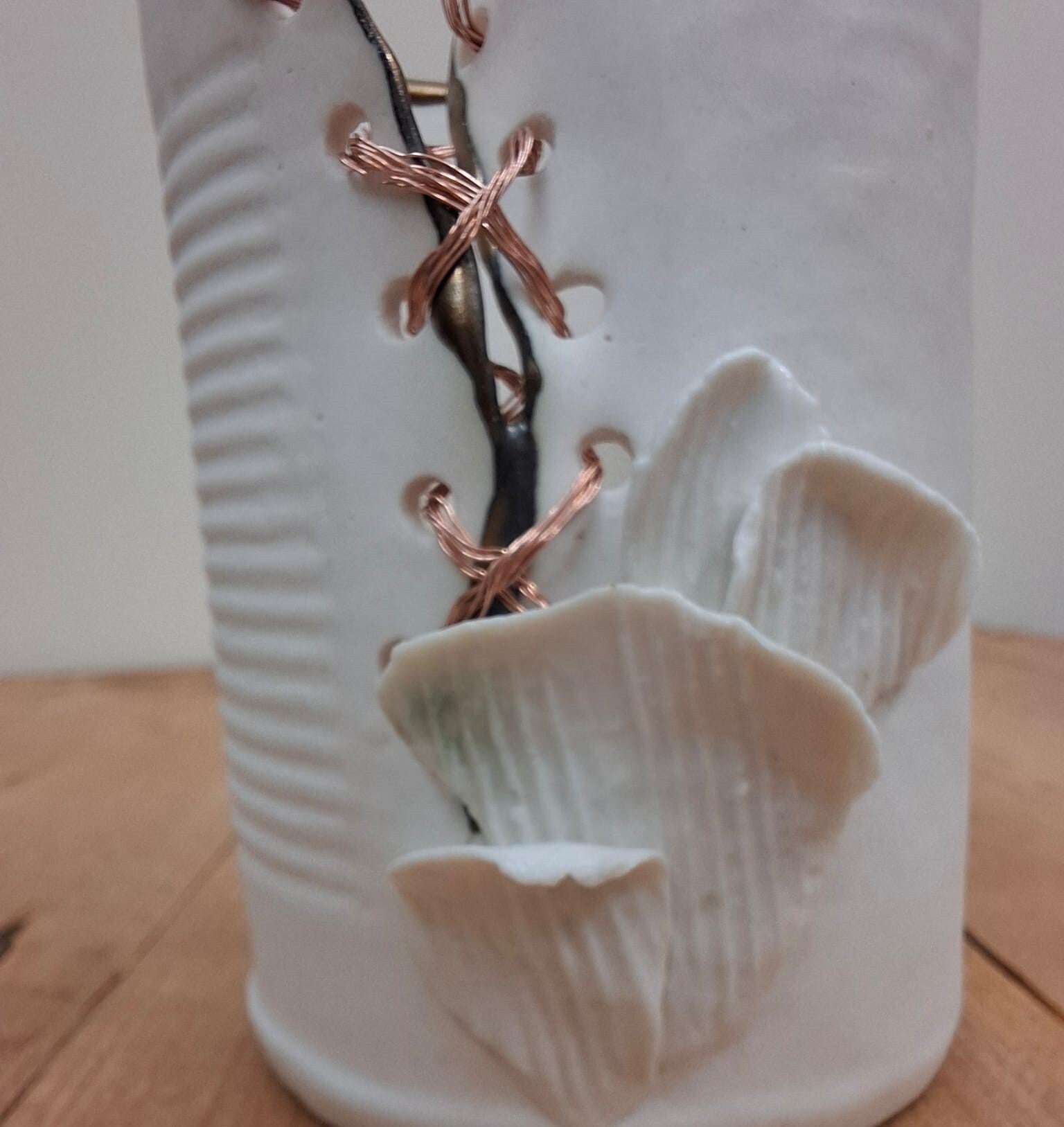 Decorated with Angel Wing Mushroom sprig moulds, which are glazed, as is the damage and the rim. Finally the damage is sewed back together using recycled copper telephone wire.