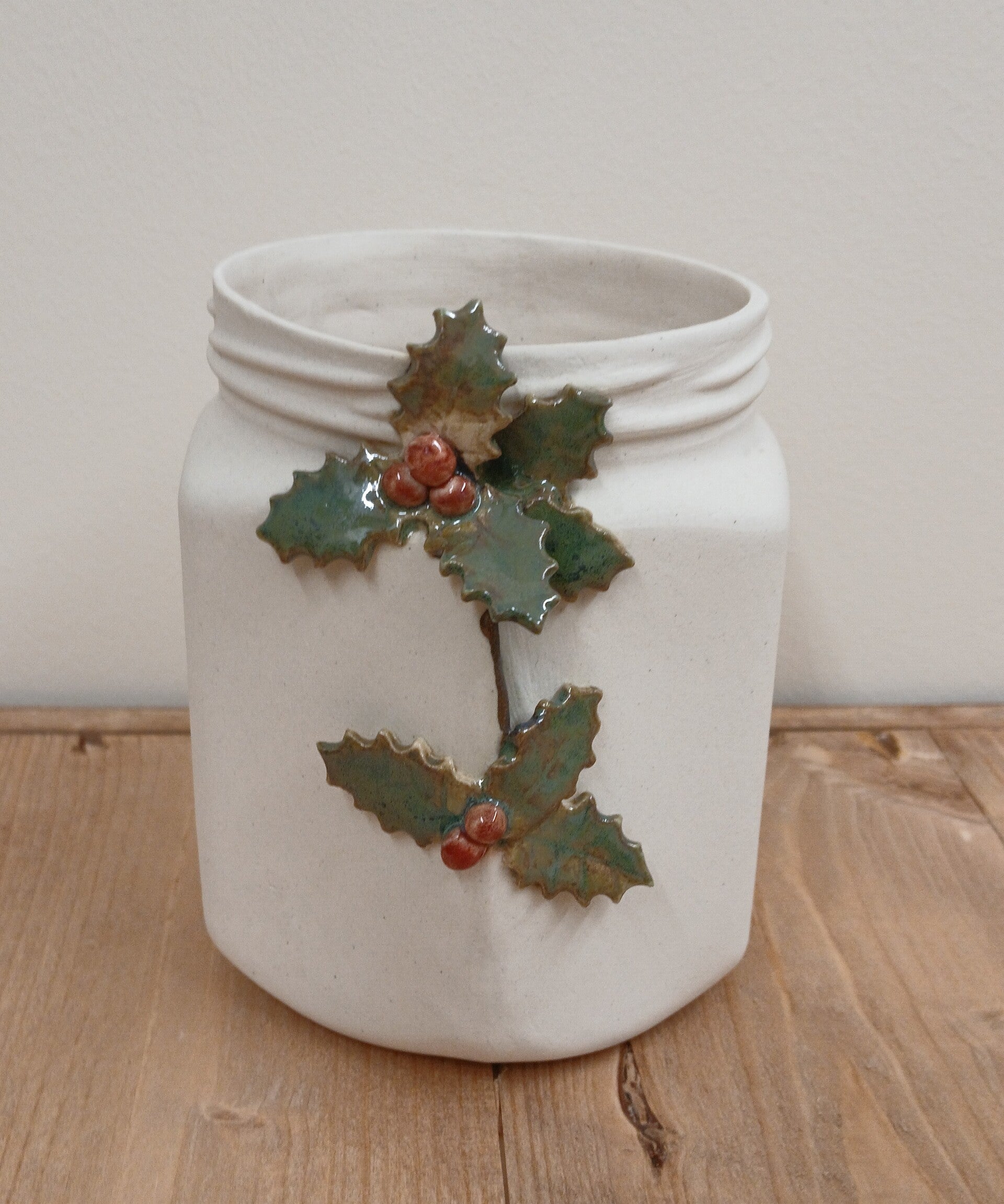 Unglazed slipcast stoneware hexagonal jar - originally a jam jar from my local Coop! Once fired the jar has been damaged and then polished to create a pleasing eggshell texture which complements and contracts with the glazed elements of the piece.