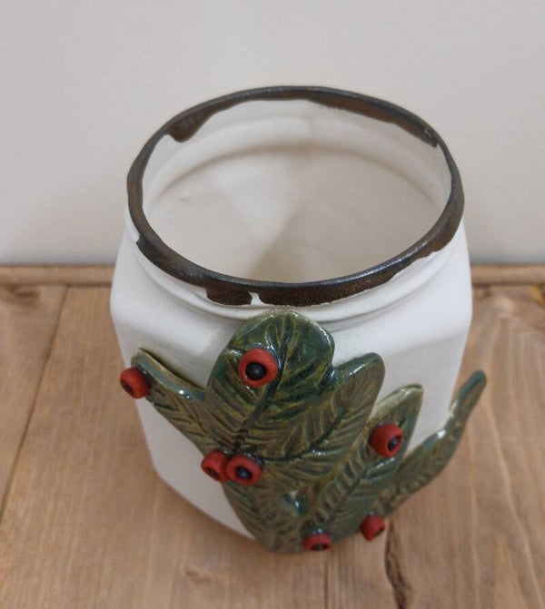 Unglazed slipcast stoneware hexagonal jar - originally a jam jar from my local Coop! Once fired the jar has been polished to create a pleasing eggshell texture which complements and contracts with the glazed elements of the piece.