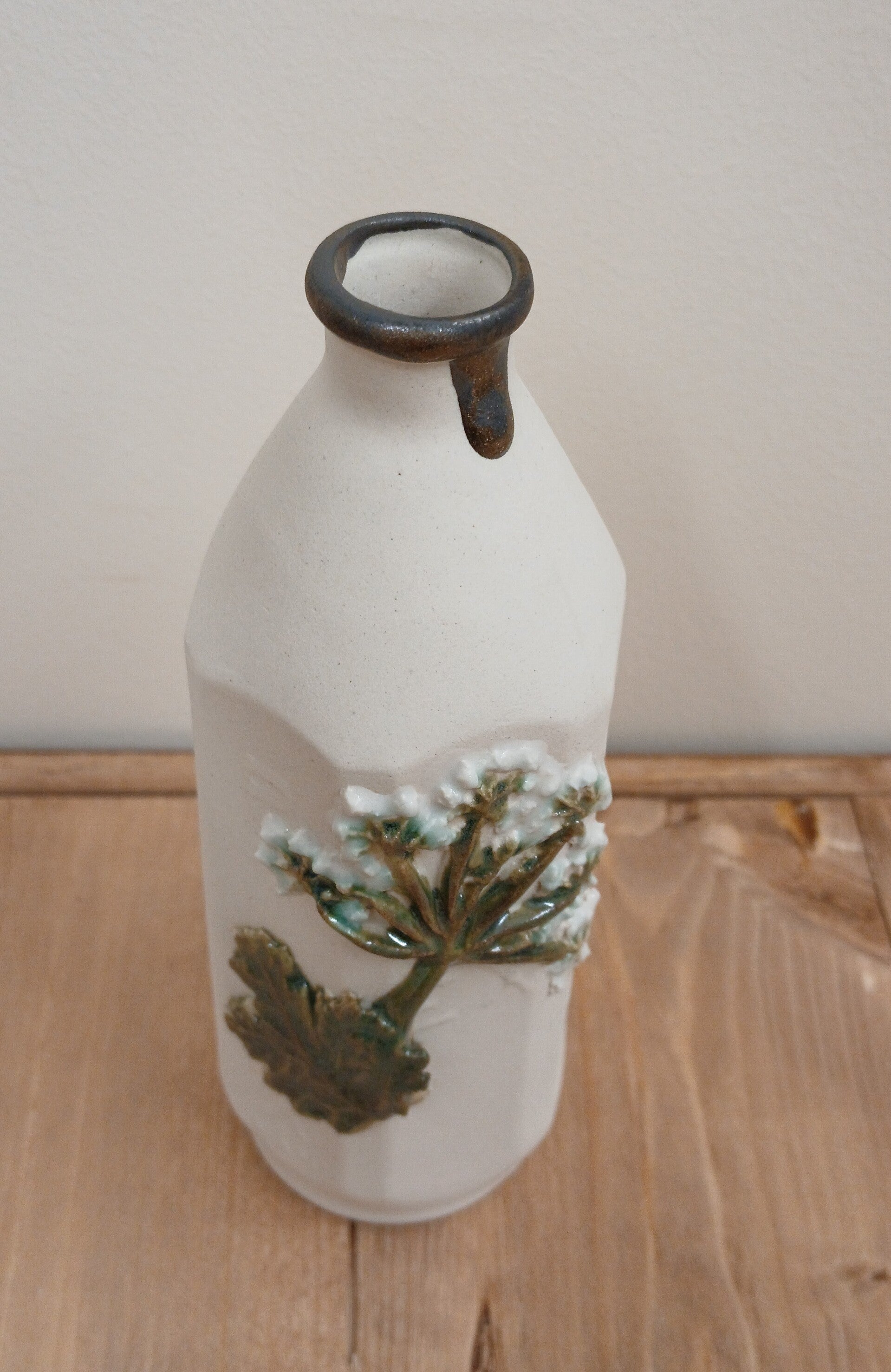 Unglazed slipcast stoneware Pyrex baby milk bottle. The unglazed bottle has been polished to create a pleasing eggshell texture which complements and contrasts with the glazed elements of the piece.