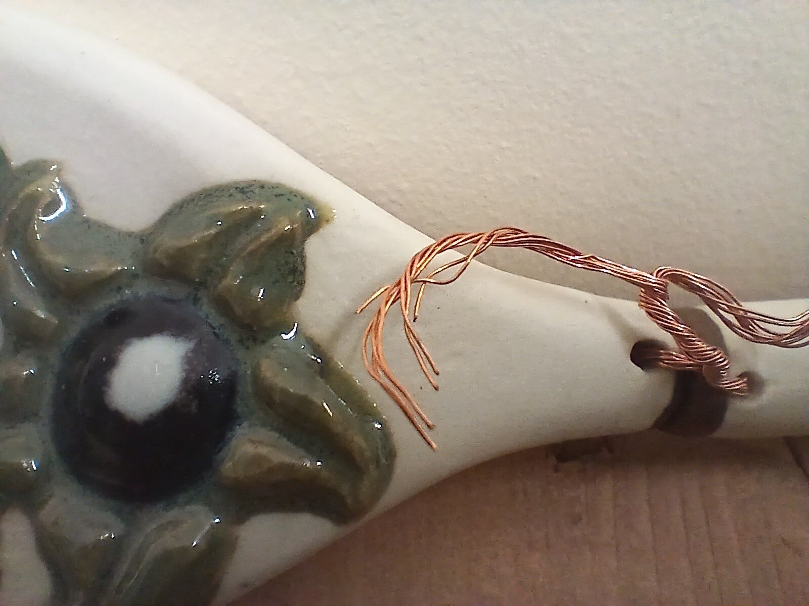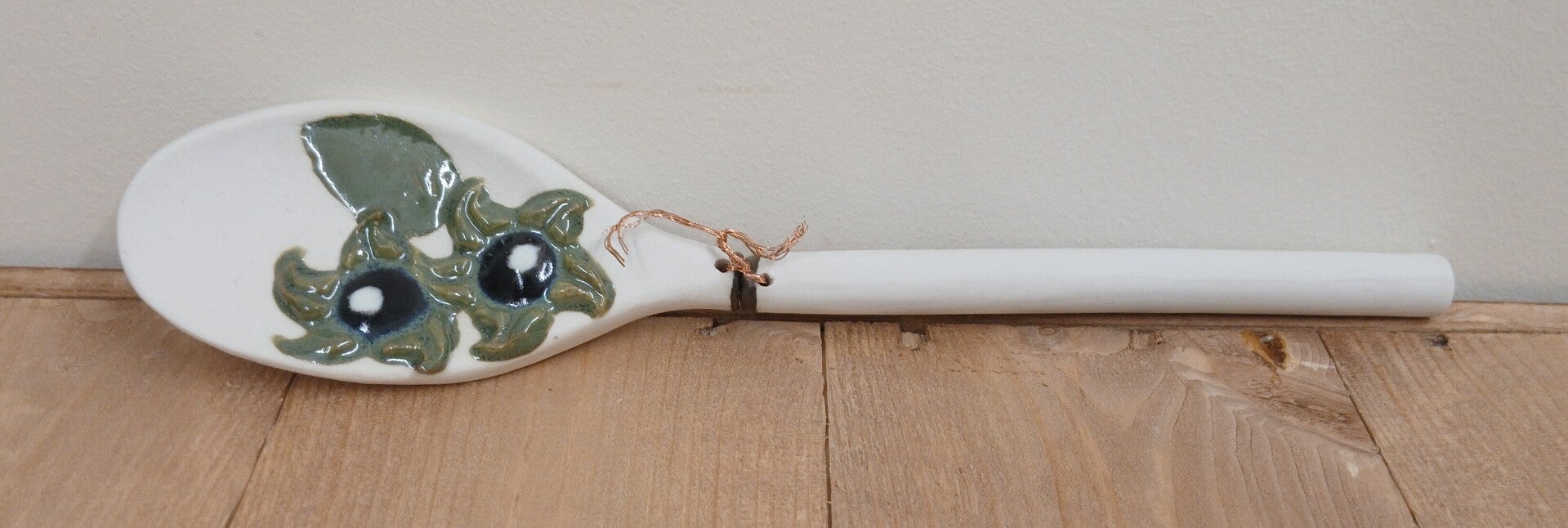 Decorated with Bella Donna (Deadly Nightshade) sprig moulds, which are glazed. Finally recycled copper telephone wire is used to join the spoon back together.